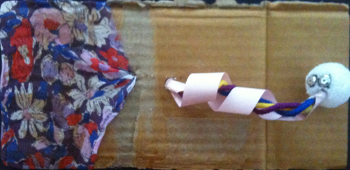 I received Michelle Kirby's autobiography. I had a bit of an advantage because I already knew Michelle, so when re-creating her autobiography to flow with mine, I decided to create a whacky little character that we would both enjoy. Her piece is made with organic shapes, color, and reflective material that reminded me of a disco ball. The strands the paper is cut into reminded me of the color spectrum. So my guy is puking graffiti on the wall. It goes in through the wall in one state, and comes out onto the wall scattered. Like the spectrum through the prism.